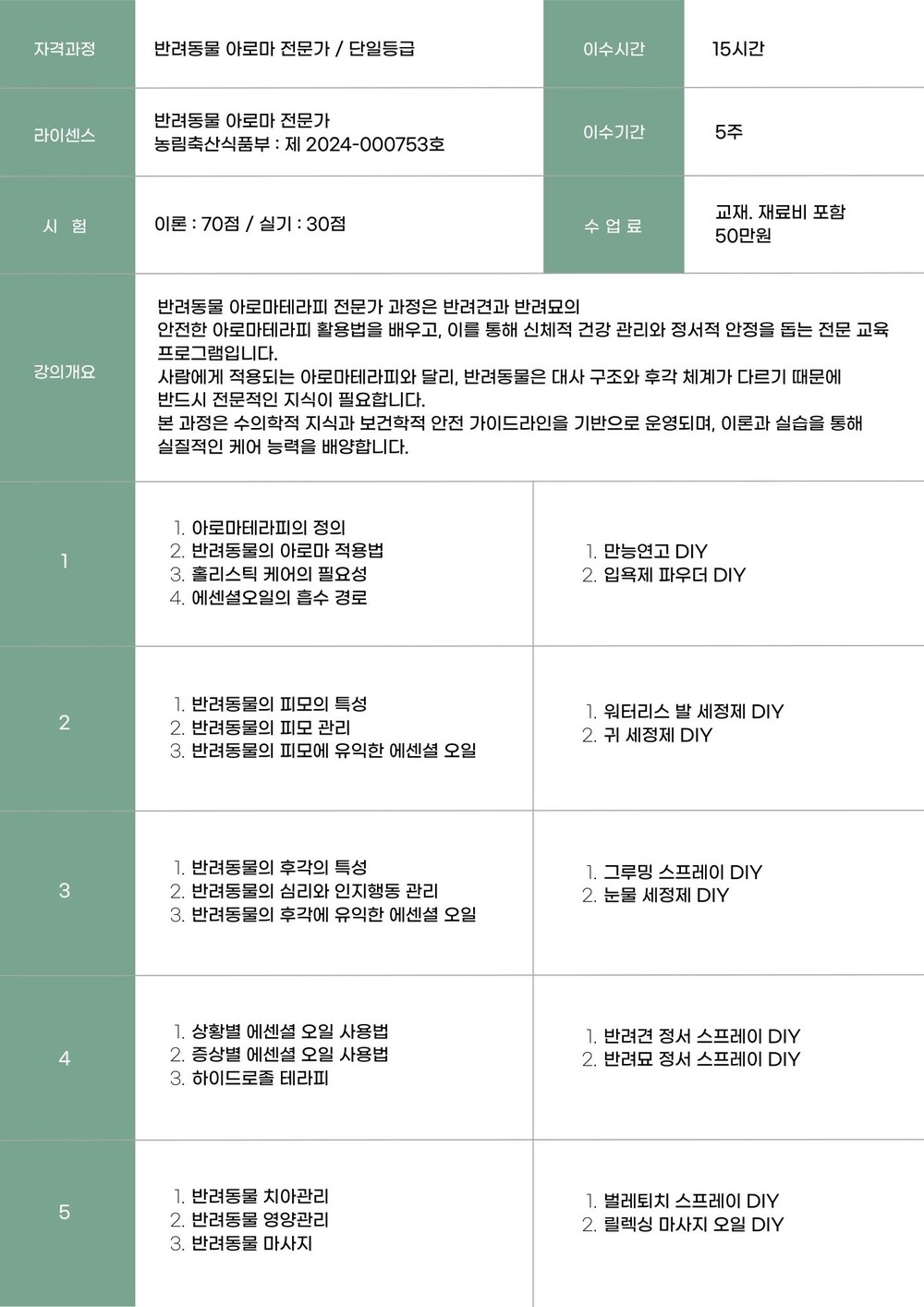반려동물의 신체적·정서적 건강을 증진하기 위해 천연 에센셜오일을 과학적이고 안전하게 활용하는 전문인력을 양성합니다. 수의학적 기초지식과 통합치유 이론을 기반으로, 향기요법을 반려동물의 생리·행동학적 특성에 맞게 적용하는 방법을 체계적으로 학습합니다. 교육과정은 다음과 같은 핵심 내용을 포함합니다. 반려동물의 해부생리학 및 감각 구조 이해, 에센셜오일의 안전성, 희석 원칙, 적용 금기 스트레스·불안 완화, 피부·피모 관리, 면역력 향상을 위한 향기 활용 반려동물용 천연케어 제품(스프레이, 샴푸, 오일 등) 제작 실습, 반려동물 행동심리와 아로마를 통한 교감 증진 프로그램 펫 아로마 테라피 윤리 및 보호자 교육 방법론 본 과정을 수료하면 반려동물 아로마테라피 전문가 자격증이 부여되며, 동물병원, 펫살롱, 반려동물 케어센터, 아로마테라피 교육기관 등에서 자연치유 전문가·펫케어 강사·반려동물 상담사로 활동할 수 있습니다. 자연의 향기로 반려동물의 스트레스와 불안을 완화하고, 사람과 동물이 함께 치유되는 공감 중심의 아로마케어 전문교육 과정입니다.